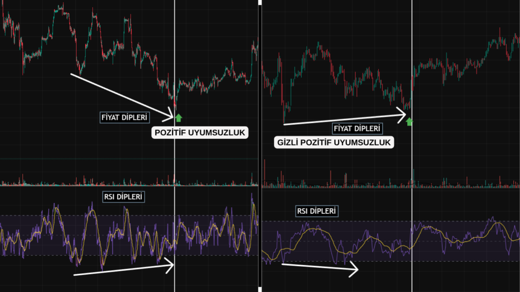 Hidden Positive (Bullish) Divergence: This occurs when the price chart forms “Higher Lows” (HL) while the RSI forms “Lower Lows” (LL). It indicates that despite the downward push in indicator momentum, the price remains strong enough not to break its previous trough, signaling that the underlying upward movement is likely to continue.