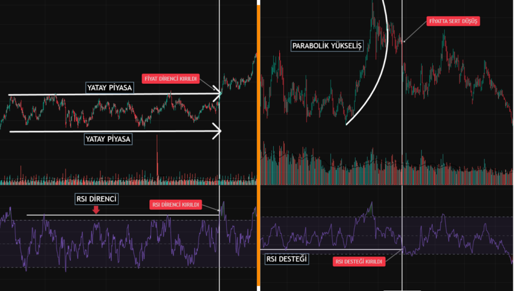 YATAY PİYASA: RANGING MARKET , FİYAT DİRENCİ KIRILDI: PRICE BREAKOUT, RSI DİRENCİ: RSI RESISTANCE, RSI DİRENCİ KIRILDI: RSI BREAKOUT, PARABOLİK YÜKSELİŞ: PARABOLIC ADVANCE, FİYATTA SERT DÜŞÜŞ: SHARP PRICE DECLINE, RSI DESTEĞİ: RSI SUPPORT, RSI DESTEĞİ KIRILDI: RSI SUPPORT BROKEN