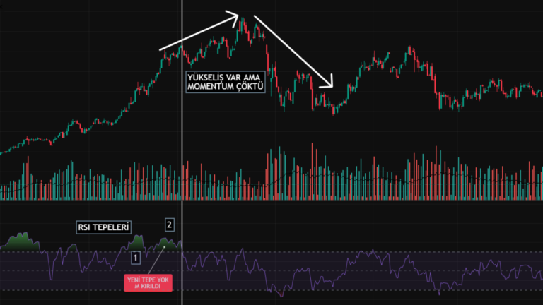 YÜKSELİŞ VAR AMA MOMENTUM ÇÖKTÜ: PRICE IS RISING BUT MOMENTUM COLLAPSED, RSI TEPELERİ: RSI PEAKS, YENİ TEPE YOK M KIRILDI: NO NEW HIGH, ‘M’ BROKEN
